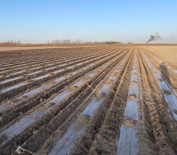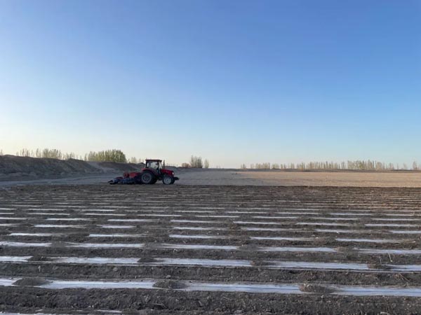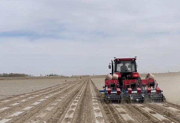 在陕西榆林,数台播种机穿梭在一片平整开阔的土地上,翻耕、耙地、播种,一片繁忙景象。