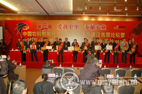 2014年1月11日,“爱我中华•奉献农业”第五届全国农科教推优秀单位与优秀人物征评活动表彰颁奖典礼在国家会议中心隆重举行,集中表彰我国新型农业社会化服务体系中的科研院所、高校、高新技术企业、农技推广、农业龙头企业、农民专业合作社等在农科教推工作中取得优异成绩的单位和个人。颁奖典礼后还举办了首都食物安全与农化服务体系建设高层论坛暨2014年放心肥料进社入户——肥料企业与用肥大户对接会。