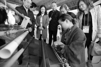 湖南省湘西土家族苗族自治州第一次组团参加农交会,具有鲜明少数民族风情的展品吸引了众多参观者。来自湘西龙山县六合村的农民汪凤琴说:“我们县是国家级贫困县,但又是土家族文化活化石‘土家织锦’之乡,现在我每年依靠织锦收入已有近两万元,像我这样依靠织锦脱贫致富的农户已有近千户。” 农民日报记者刘刚摄