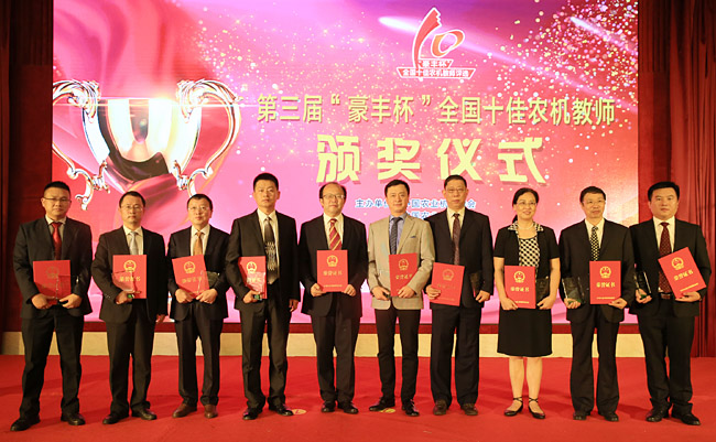 全国十佳农机教师评选活动受到了全国多所高校热烈响应,共推荐了20位长期奋战在农机教育事业一线的优秀教师。经过网络评审和现场评审,最终吉林大学生物与农业工程学院教授于建群、华南农业大学工程学院教授马旭、中国农业大学工学院教授王书茂等10位教师当选为第三届“豪丰杯”全国十佳农机教师。全国政协委员柯柄生、中国工程院院士罗锡文、农业部农业机械化管理司司长李伟国等为获奖教师颁了奖。