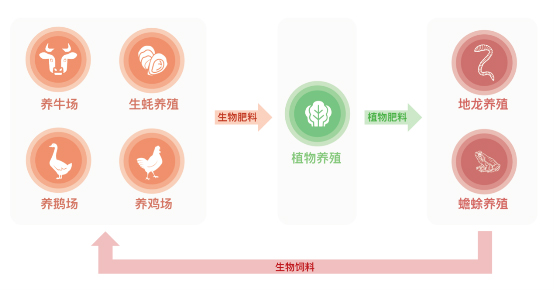 所谓生态循环农业,就是养牛、养鹅、养鸡等家禽养殖,产生生物肥料,用于植物养殖,然后又生成了植物肥料,可用于地龙养殖和蟾蜍养殖,又产生了生物饲料,可用于家禽养殖。