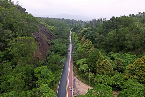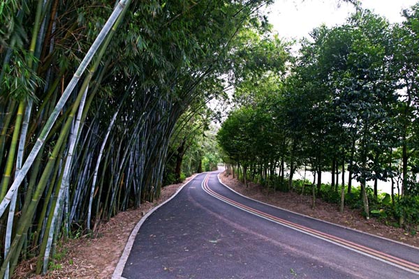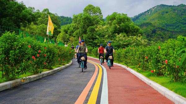 会同-那洲绿道环线全程10公里串连起了那洲社区、会同社区的多个村庄,形成闭环状路线。从高新区唐家湾镇会同古村出来,沿着那溪河边上的绿道,往那洲方向走约2公里,即可到达一个古桥,桥头处设有充满版画元素的岭南标识牌,上方写着“美丽那洲”,即为会同-那洲绿道环线新建部分的起始点,那洲也是版画大师古元的故乡。沥青铺就的绿道,以彩色带为分隔线,设有自行车道、人行道;可骑行、漫步、慢跑。一河两岸,山环水绕;有山景、村庄、菜园、那溪河叠水;沿途可领略水岸风情、绿色田园风光。环线中设置亲水平台、休憩点,可供游客拍照打卡、停歇休息。