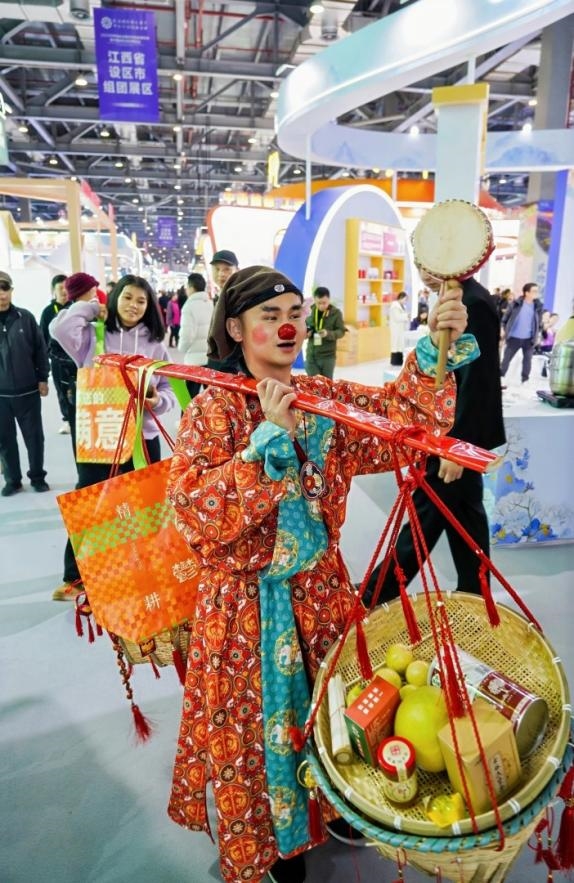 展区现场,“包满意”特色编织袋和“鬱家货郎”巡游表演吸引大量采购商和市民驻足互动。巡游人员身着传统服饰,肩挑满载玉林农产品的扁担,沿途进行特色吆喝推介,这些创新互动形式既增强了观众体验感,又有效传播了品牌理念,形成良好的社交传播效应。